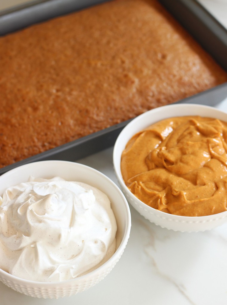 Gently spread the remaining pumpkin butterscotch mixture over the cake crumbs.