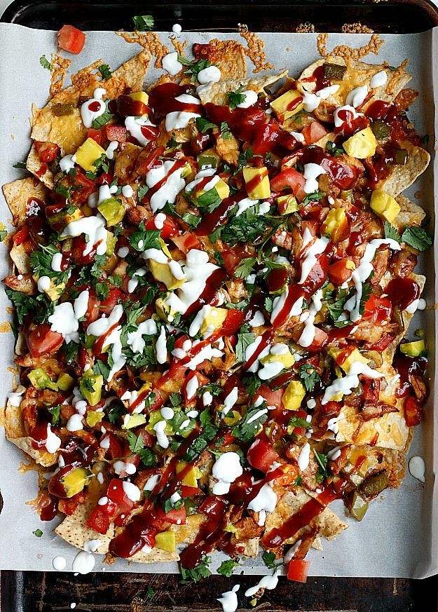 In a large skillet, spread out two large handfuls of tortilla chips. Layer with half of the barbecue chicken, followed by half of the cheese, onion, tomato, bacon, and parsley. Repeat with the remaining ingredients. Bake for 15 minutes.
