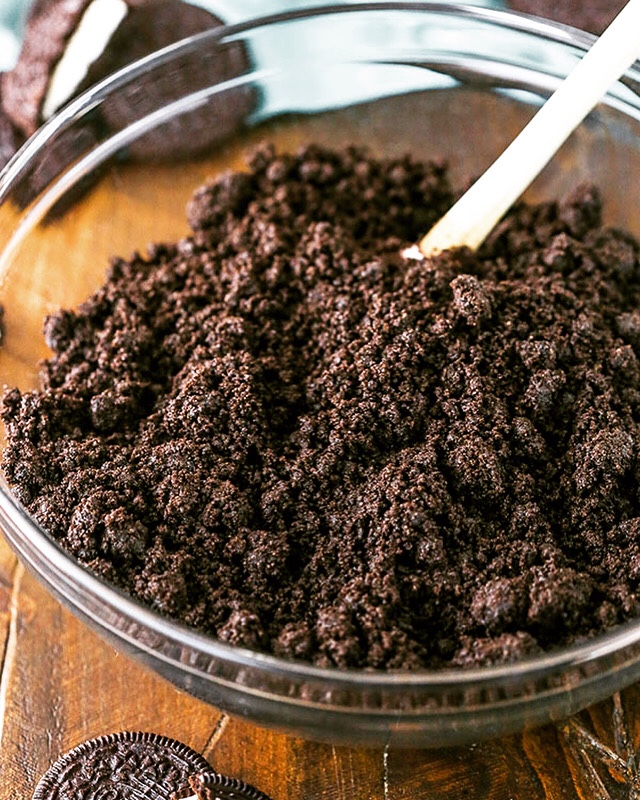 🔸Make crust: In a large Ziploc bag or a food processor fitted with a metal blade, crush or blend Oreos until fine crumbs form. Transfer to a bowl and pour in melted butter. Add salt and stir until crumbs are completely coated and moist.