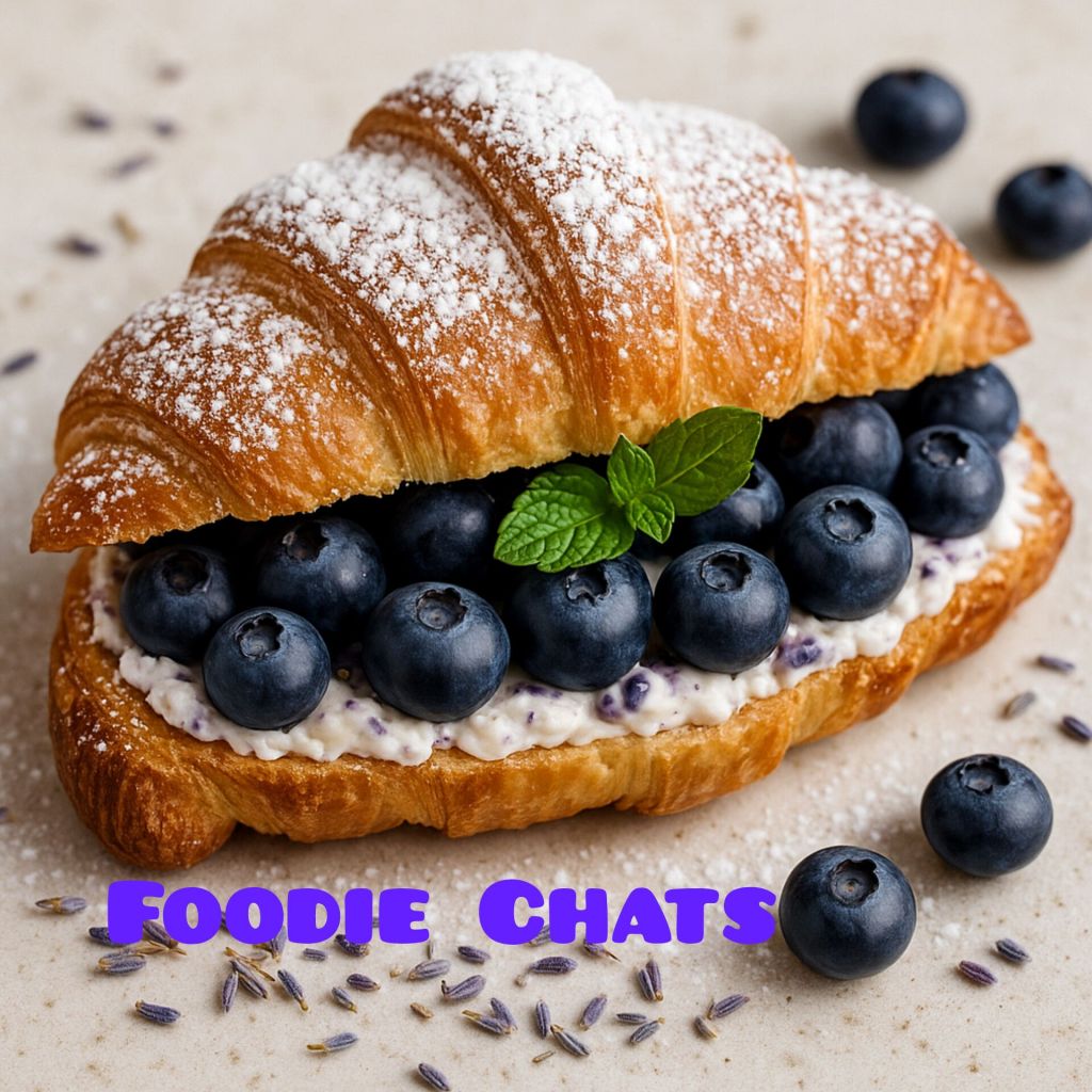 A scrumptious bite of summer: buttery, flaky croissant layered with creamy lavender-infused goat cheese, bursting blueberries, and a hint of fresh mint. Sweet, floral, tangy, and totally irresistible. Perfect for brunch, picnics, or treating yourself to something beautiful.